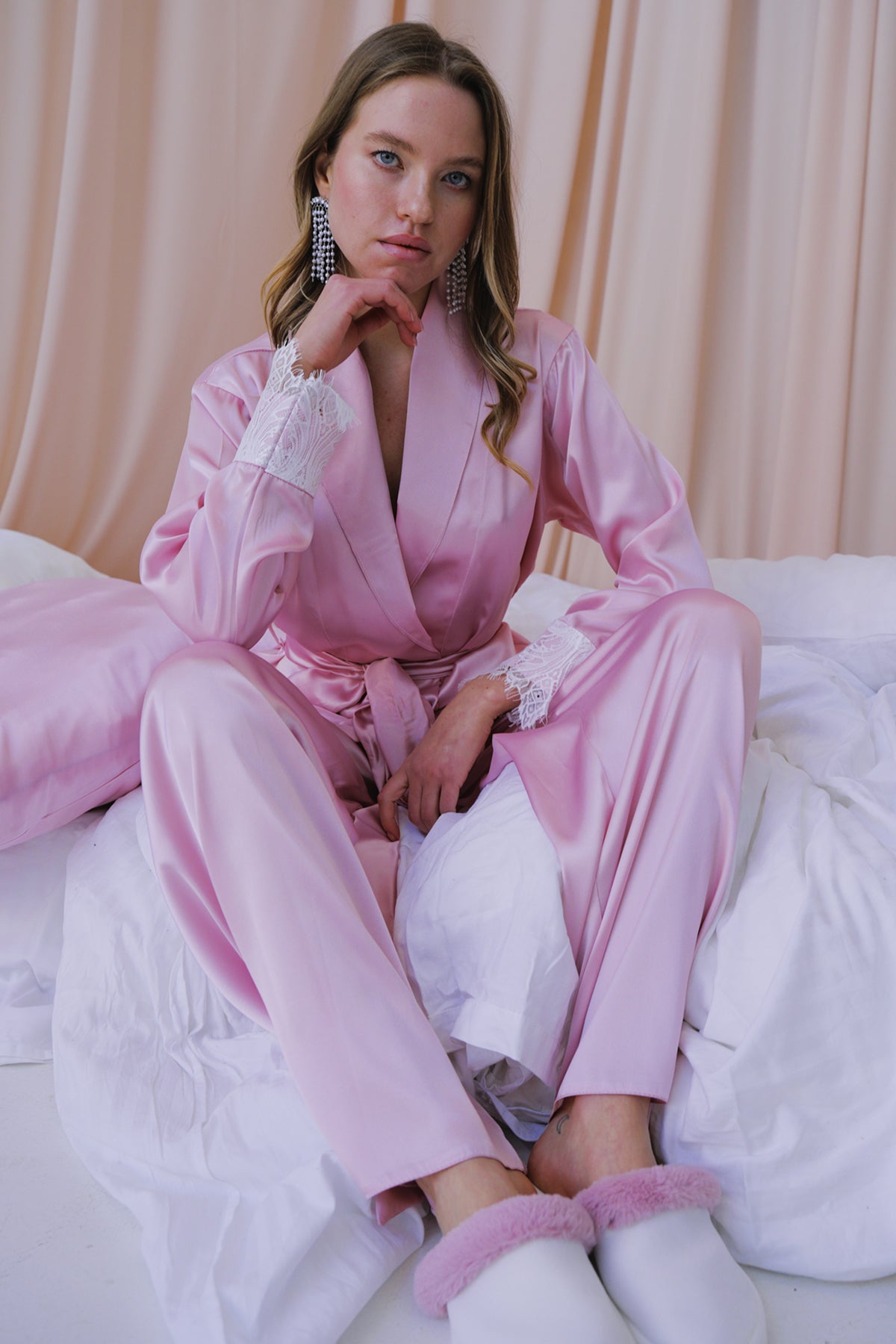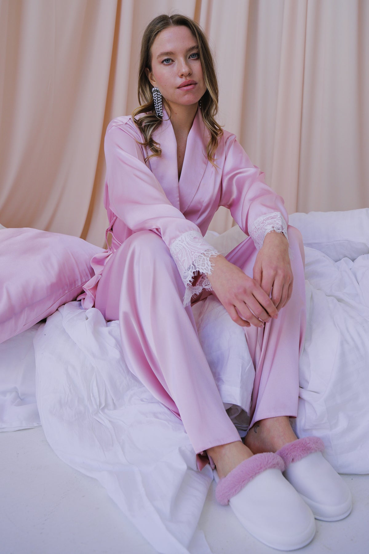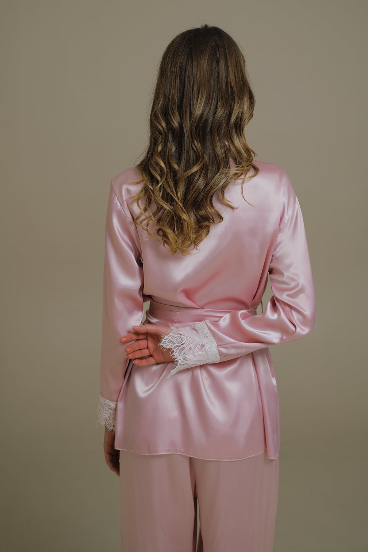 PUDRA SATEN ŞAL YAKA KİMONO-PANTOLON TAKIM