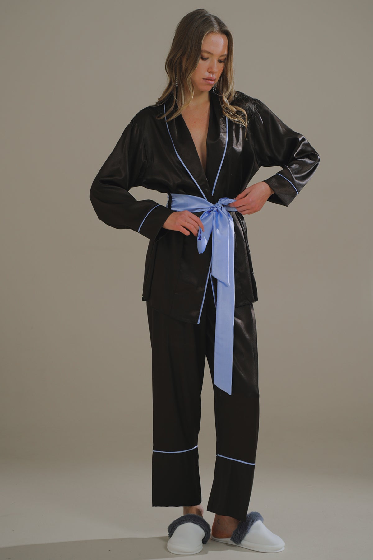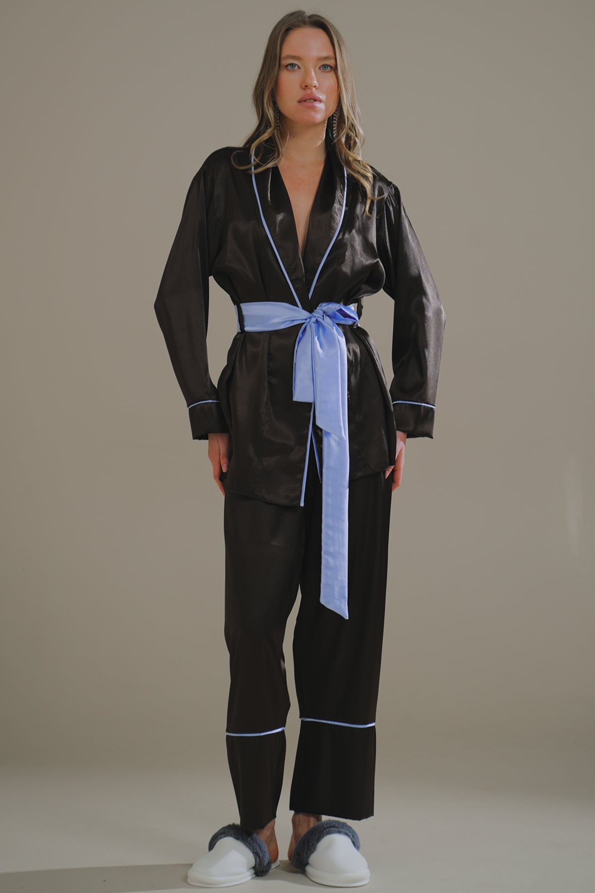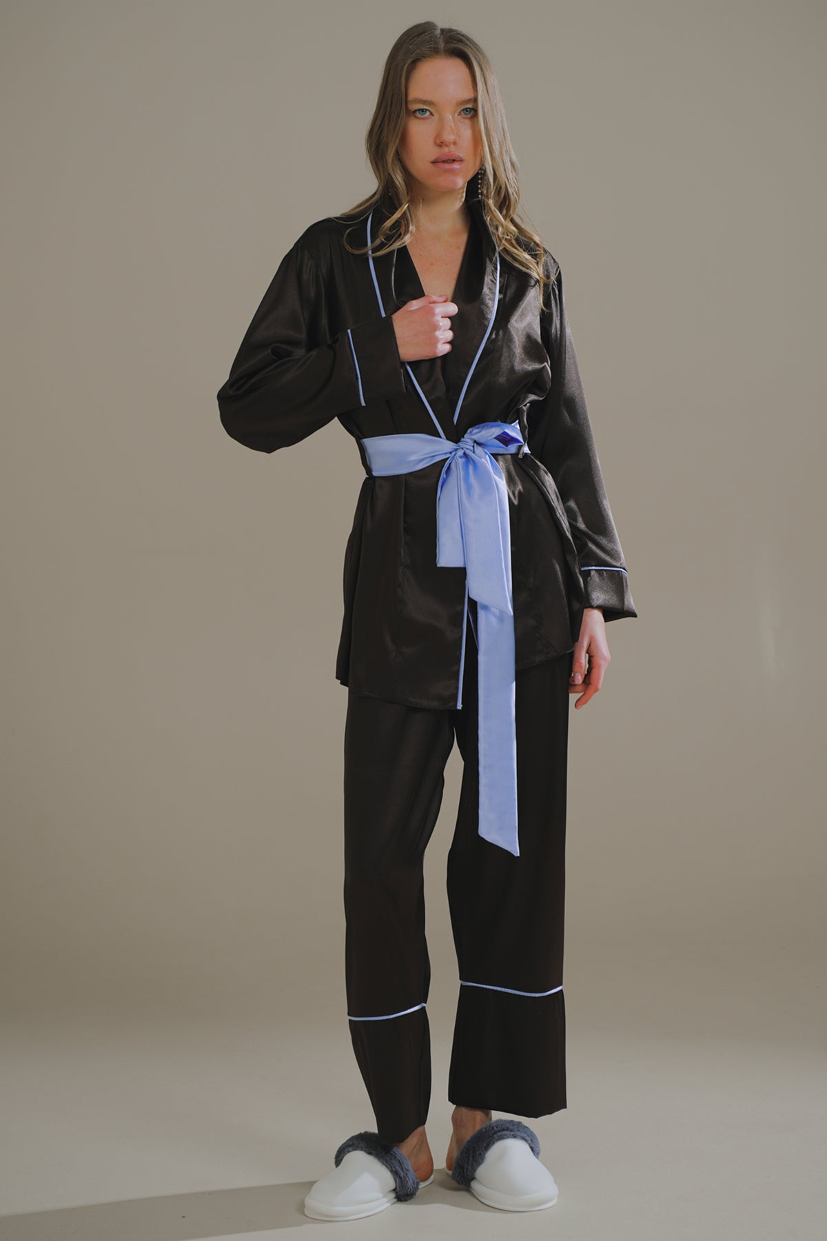 ACI KAHVE-MAVİ MIKS SATEN ŞAL YAKA KİMONO-PANTOLON TAKIM