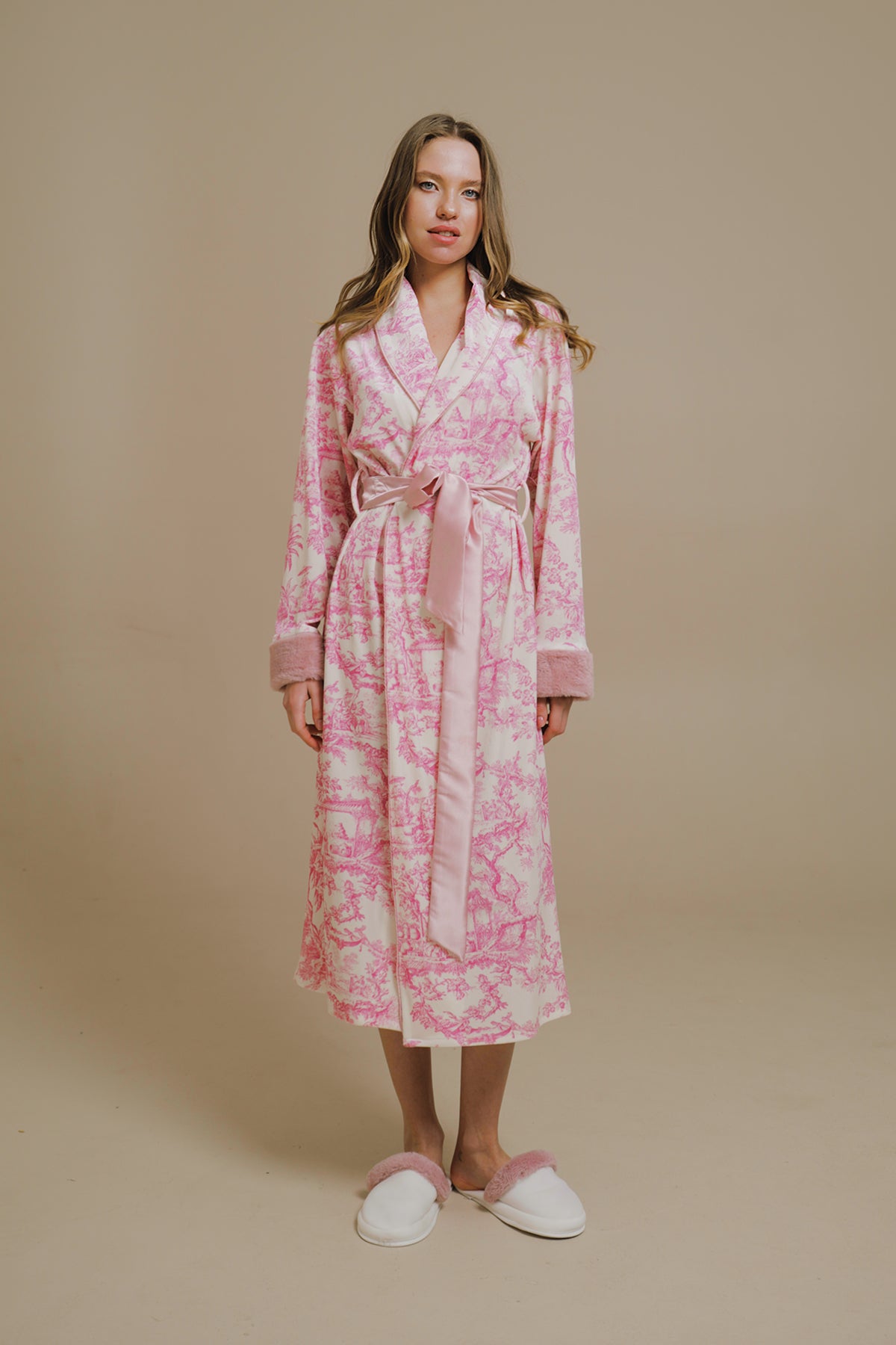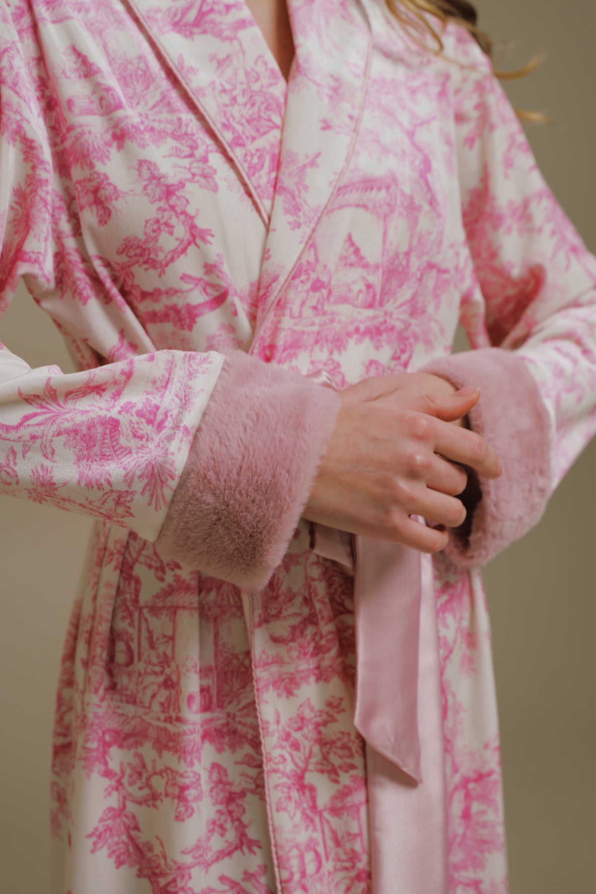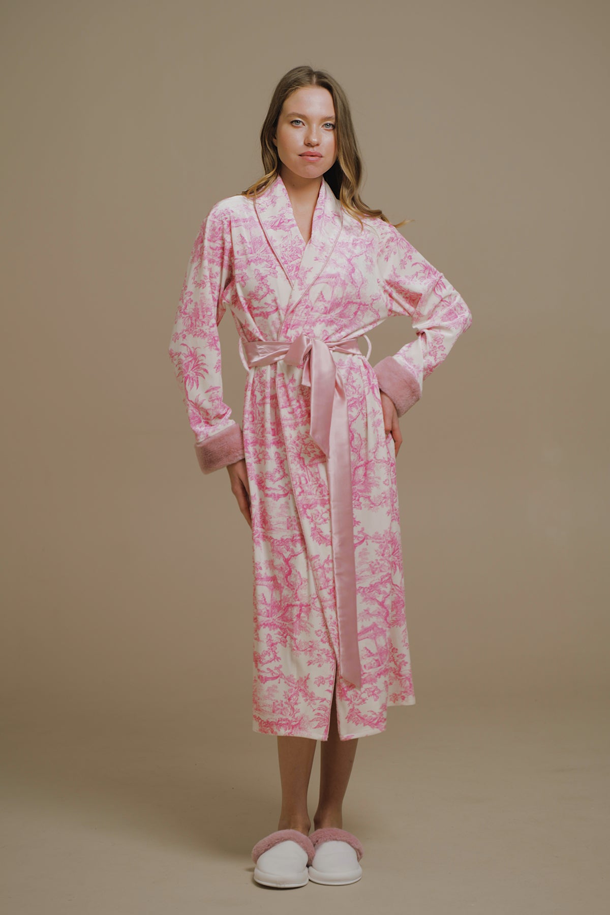 PEMBE KADİFE PELUŞ DETAYLI ŞAL YAKA KİMONO